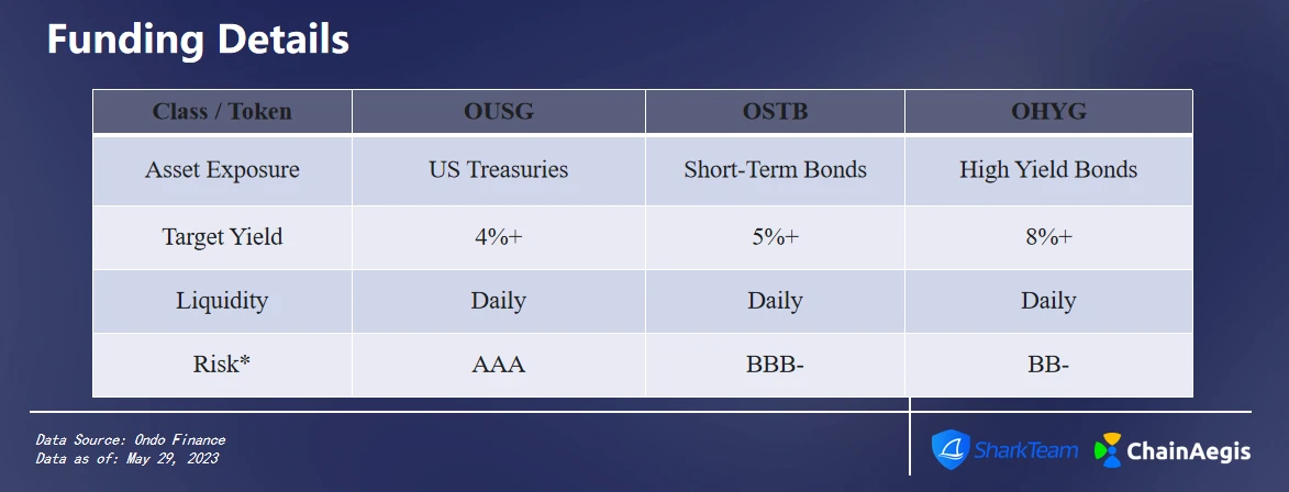 2023 年 1 月, Ondo Finance 宣布推出代币化基金, 为用户提供链上投资美国国债和机构级债券的机会。据了解, Ondo Finance 是 通过由资管 机构 Blackrock 和 PIMCO 等管理的大型、高流动性 ETF ,推出了三种代币:美国政府债券基金 (OUSG) 、短期投资级债券基金 (OSTB) 以及高收益公司债券基金 (OHYG) 。 Ondo Finance 将收取按年化计算的 0.15% (每月 0.0125% )的管理费,这些费用在基金的产品页面上均可以找到。