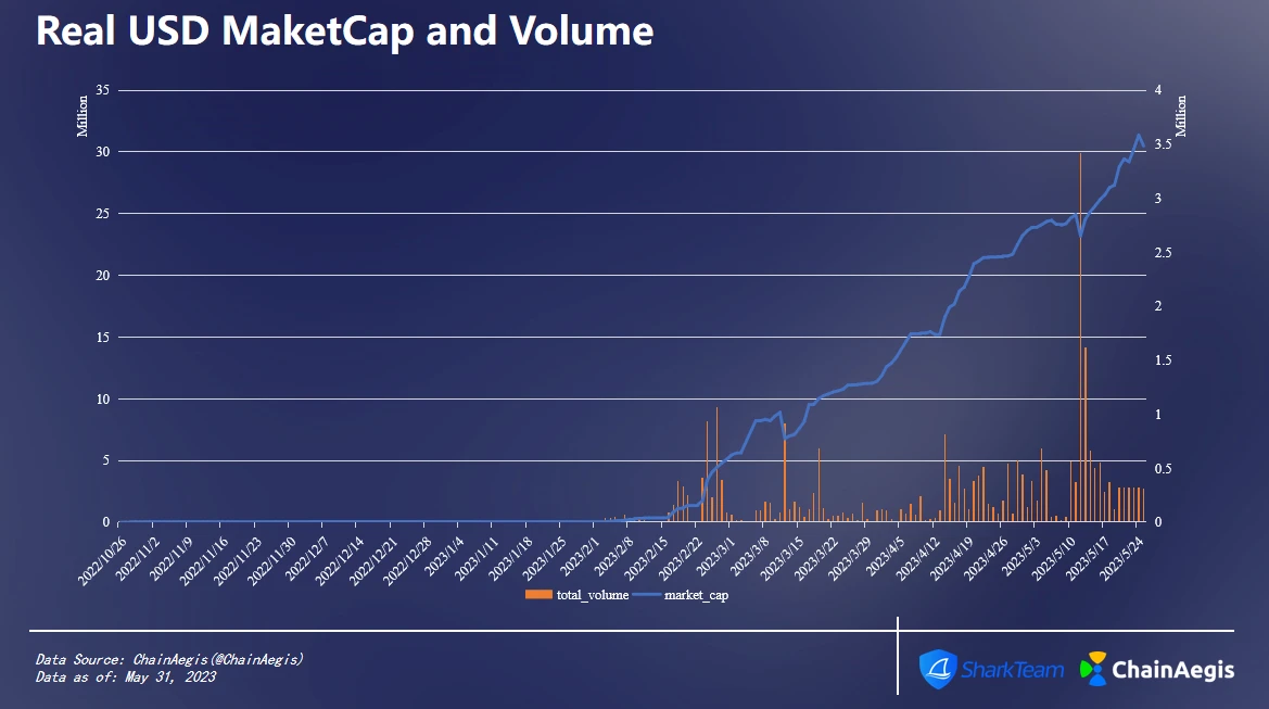 2023 年 2 月起, USDR 的市值与交易量均呈现大幅增长的趋势。 5 月 12 日,交易量达 341.74 万美元,创上线以来历史新高,当日 TVL 为 2319.73 万美元。 5 月 30 日, TVL 达历史顶峰,为 3136.44 万美元,短短半月, TVL 涨幅达 35.2% 。