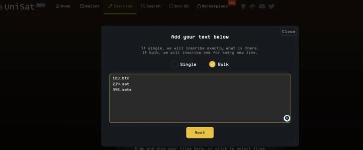 如果 Unisat 上没有相关后缀域名,用户可通过 Text(文本类)对话框,输入想要的字符后缀域名即可,可支持批量铸造不同后缀的域名。