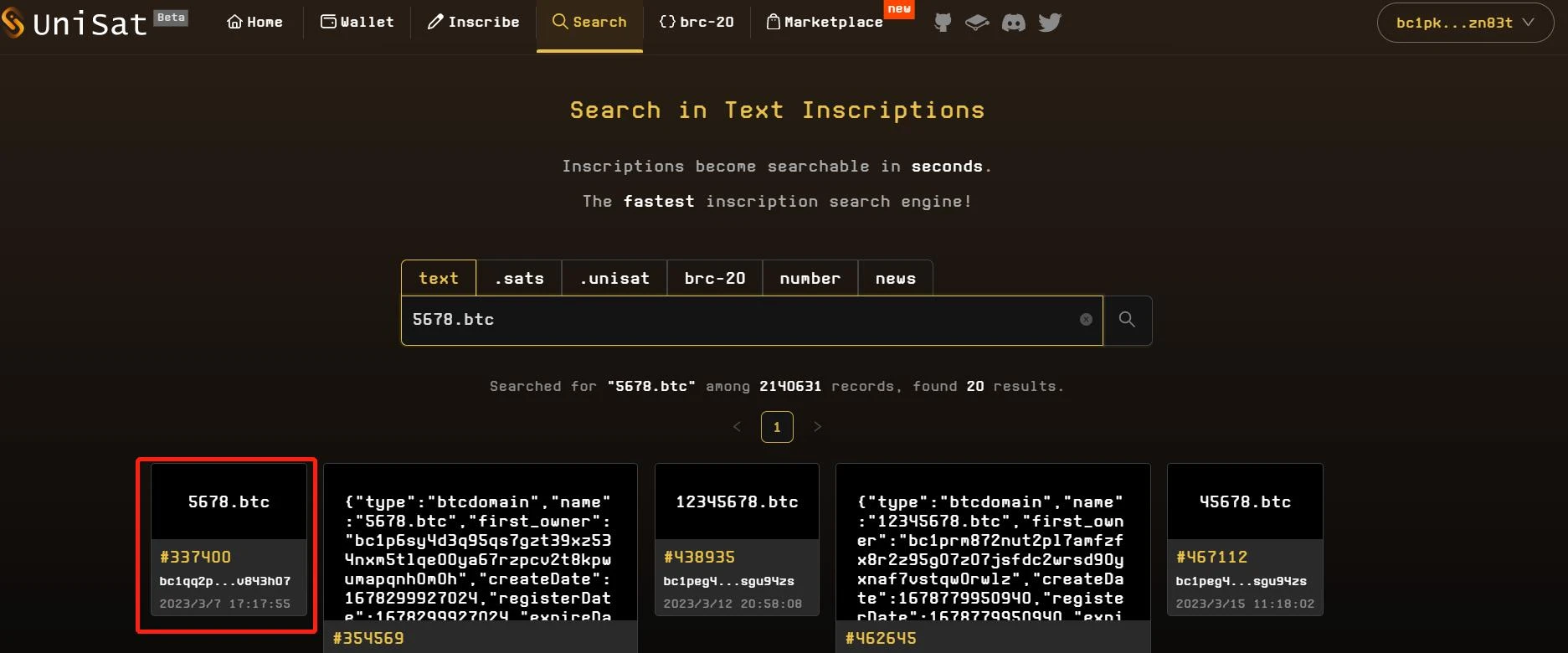 Unisat——支持域名查重、注册。5 月 31 日,已上线.sats、.unisat 域名交易市场,还可将其域名解析到比特币钱包地址上,用户使用.sats、.unisat 域名就可接收比特币资产及铭文。