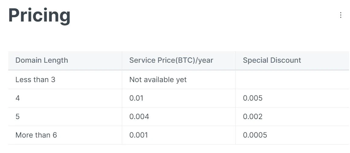 如果域名已被注册,那么用户可在比特币 NFT 交易市场或者场外点对点购买,价格取决于卖家的挂单价;如果域名还未被注册,用户就可以在支持比特币铭刻铭文的平台或者使用代码直接铭刻即可,只需支付比特币链上 Gas 费(目前每笔交易约为 3 美元),后期无任何费用。