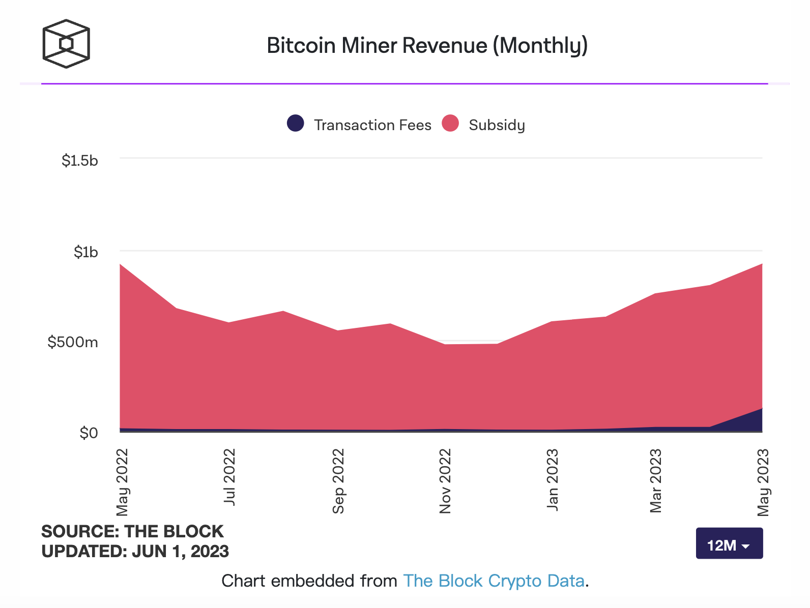 2023年5月比特币网络的矿工总收入达9.166亿美元,环比增长13.7%