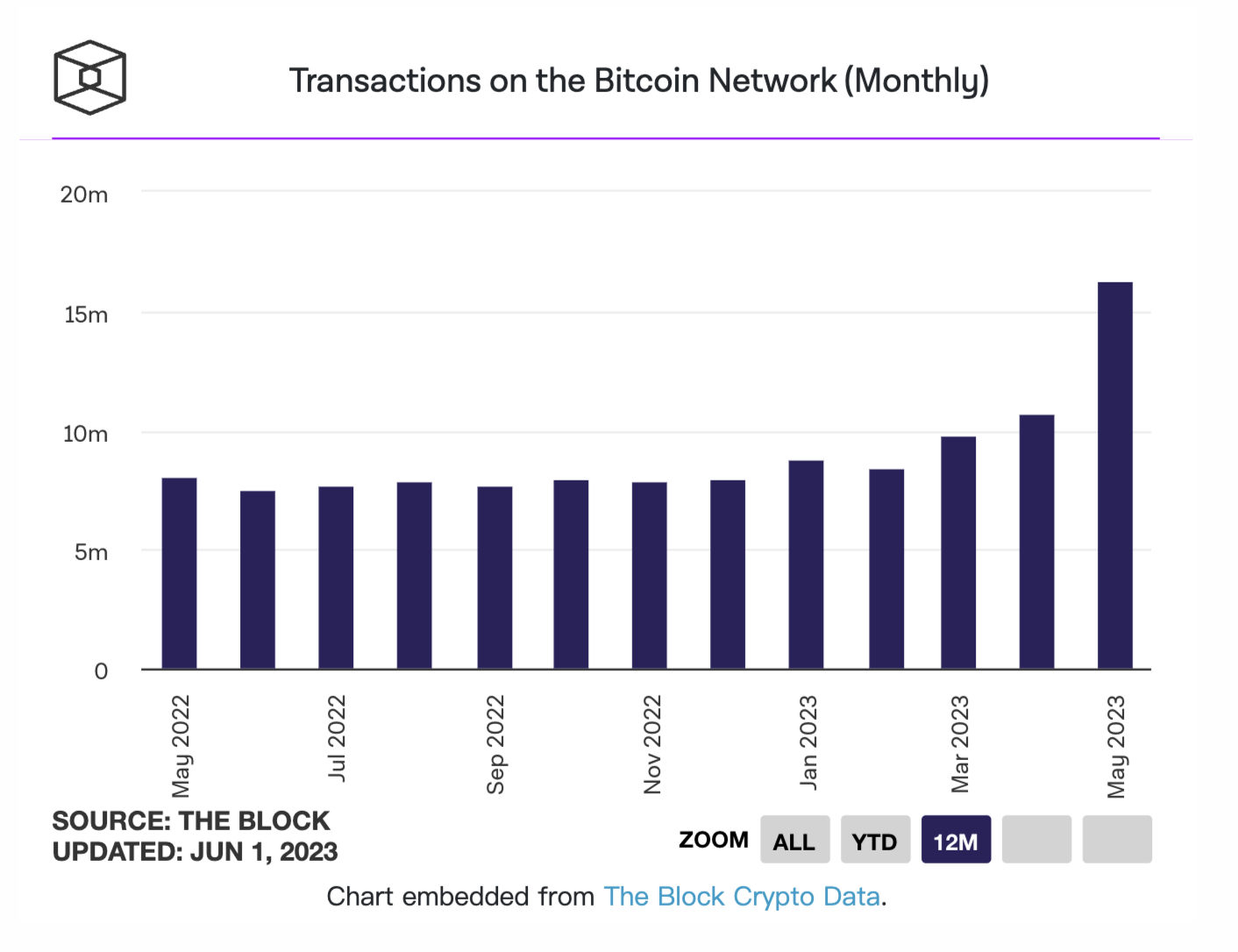 博链财经BroadChain获悉,6月2日,The Block数据显示,2023年5月 比特币 网络的矿工总收入达到了9.166亿美元,环比增长13.7%。