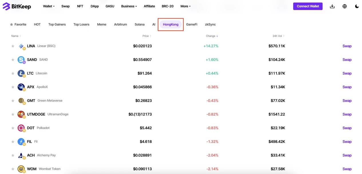 如今各个赛道纷纷开始在布局香港概念。香港市场尚处于初期,缺乏必要的基础设施,BitKeep 钱包作为千万用户进入 Web3 世界的入口,常年为用户提供最便捷的资产管理服务。支持 90+ 主流公链及 25 万 + 链上资产,NFT 市场和一键完成资产兑换等服务因有尽有,如今也设立了香港概念币专区,实时 K 线、项目详情、行情异动提示等功能可以帮助新手轻松体验区块链世界的魅力。