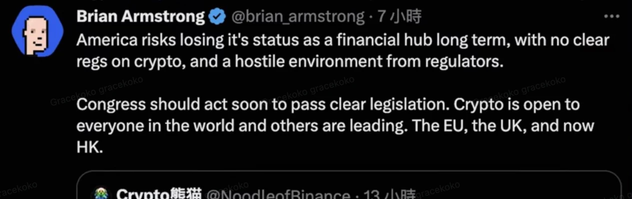 Coinbase 首席执行官 Brian Armstrong 曾在 twitter 中说:美国面临着长期失去金融中心地位的风险。因为他们对于加密货币没有明确的监管规定,其监管机构的环境也十分恶劣。加密市场在开放,其他地区在领先,之前是欧盟和英国,现在是香港。