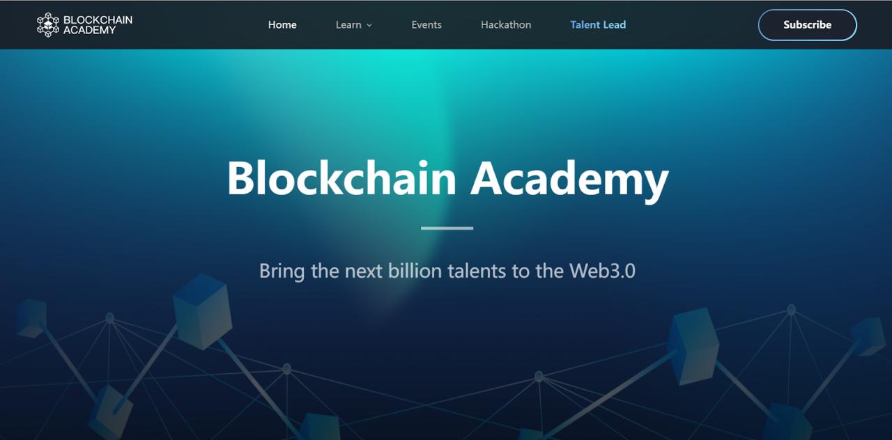 Blockchain Academy 是 Talentre 旗下的一家非营利组织,由香港科技大学 Crypto-Fintech Lab 等联合发起的 Web3.0 教育平台,旨在向用户传授 Web3.0 知识和技能。网站涵盖学习、活动、BuildCamp 和黑客松板块。