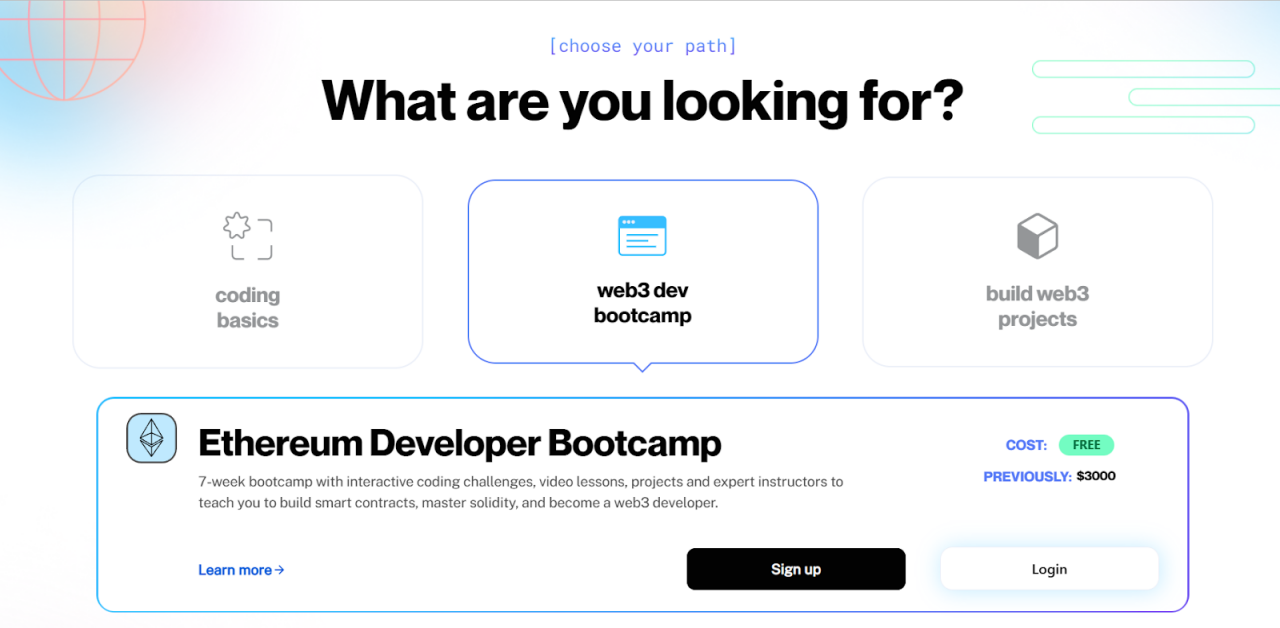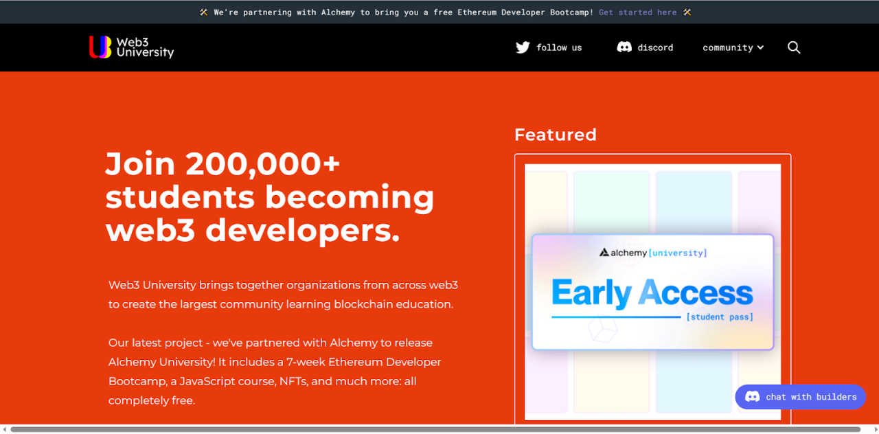 Alchemy University 是区块链开发平台 Alchemy 与其收购的教育初创公司 ChainShot 合作推出的 Web3 学习平台 Alchemy University,训练营内容包括密码学、Solidity 开发、智能合约安全、代理合约、委托调用等,既是一门 Web3 开发课程,也可作为一个用于构建技能和网络的完整生态系统。