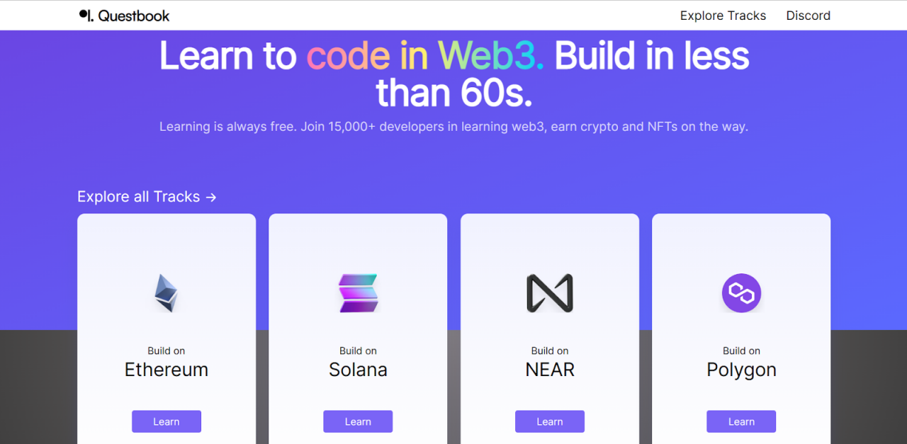 Questbook 是一个为 Web3 构建者提供的捐助和赏金的工具,也发布了一个去中心化的学院,帮助开发者学习在 Web3 中编码,涵盖以太坊、Solana、NEAR 以及 Polygon 上的免费编码知识,完成任务后还可获得 NFT 奖励。