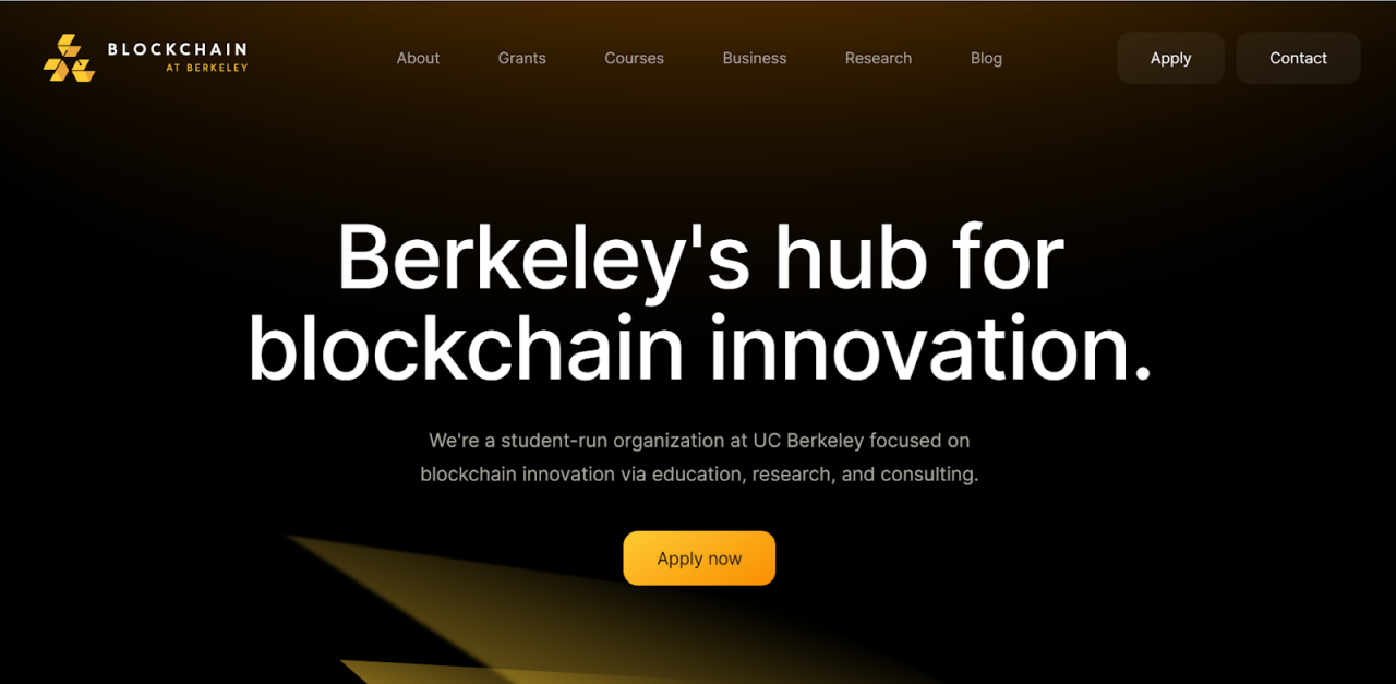 Blockchain at Berkeley 是加州大学伯克利分校的一个学生组织,于 2016 年 10 月由伯克利比特币协会(Berkeley Bitcoin Association)成立,推出了世界上第一个本科大学认可的区块链课程。Blockchain at Berkeley 的课程包括区块链基础知识、区块链开发、区块链技术以及比特币&加密货币等。
