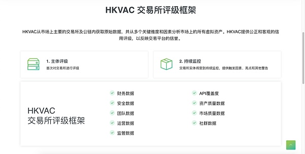 根据当前网页信息(https://www.hkvac.io/index.html),HKVAC将推出“虚拟资产指数”及 “虚拟资产交易所评级”两大板块。