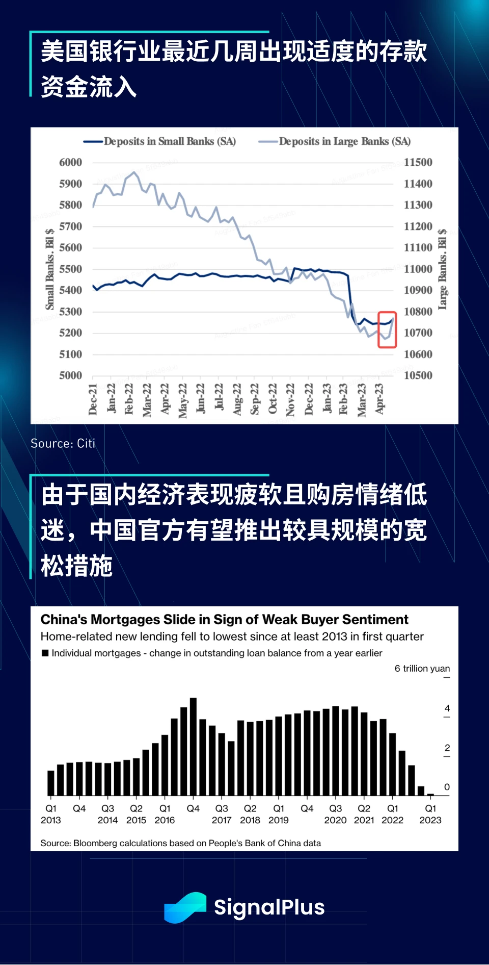 在其他方面, 3 月银行危机似乎已经完全过去,美国银行持续出现小幅度的存款流入,而中国则再次暗示宽松政策,加剧了风险偏好情绪,刺激恒生指数在经历数周的表现不佳后反弹 4% ;由于中国在重开后经济表现仍不理想,人民银行和外管局目前面临需要提供大规模宽松措施的巨大压力,特别是考虑到中国国内房地产市场的疲软,预计激进的宽松措施将有望重振买家情绪。