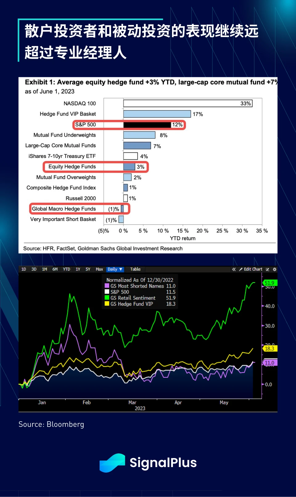 下周数据面会较为清淡, CPI 将在 FOMC 会议前发布,可能是唯一有机会影响市场走势的数据 。美国股市仍一路飙升, Nasdaq 指数今年以来上涨 33% (!),而 SPX 也上涨了 12% ,另一方面,由于专业经理人再次错过反弹行情,今年为止股票对冲基金的平均报酬率仅为 3% ,而全球宏观对冲基金表现仅持平,另外在策略方面,得益于 AI 和科技股的出色表现,散户偏爱的股票继续跑赢几乎所有其他的策略,让人不得不质疑“笨钱 (dumb money)”称号究竟是属于谁?