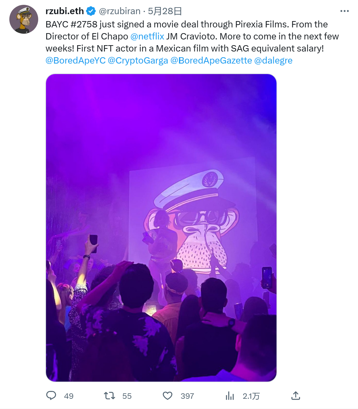 Rzubi.Eth最近通过Pirexia Films签署了一项电影协议,其拥有的无聊猿 #2758将在JM Cravioto执导的电影中扮演网红“Scully Joe”这一角色。