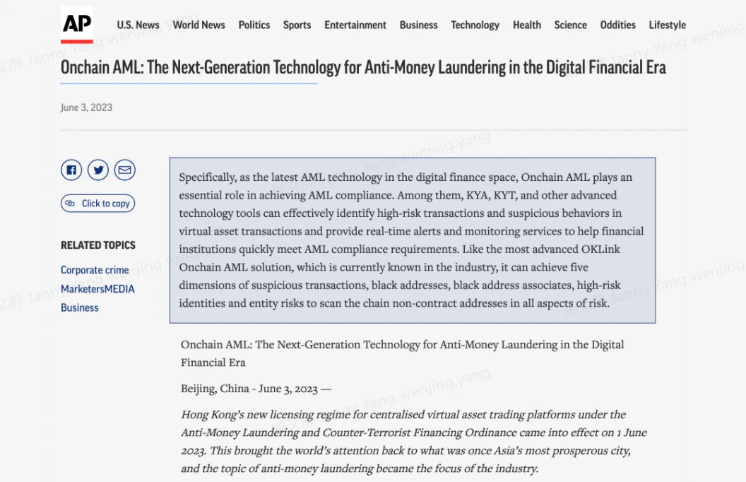 针对这一热点话题,全球五大通讯社之一的美联社发表了一篇文章《链上 AML:数字金融时代反洗钱的下一代技术》,详细阐述了反洗钱(AML)的历史背景和技术发展过程,并指出 Onchain AML 将成为交易平台合规申牌以及金融机构进入虚拟资产领域的关键因素,文章报道了欧科云链 OKLink 推出的链上 AML 产品受到市场的广泛关注。