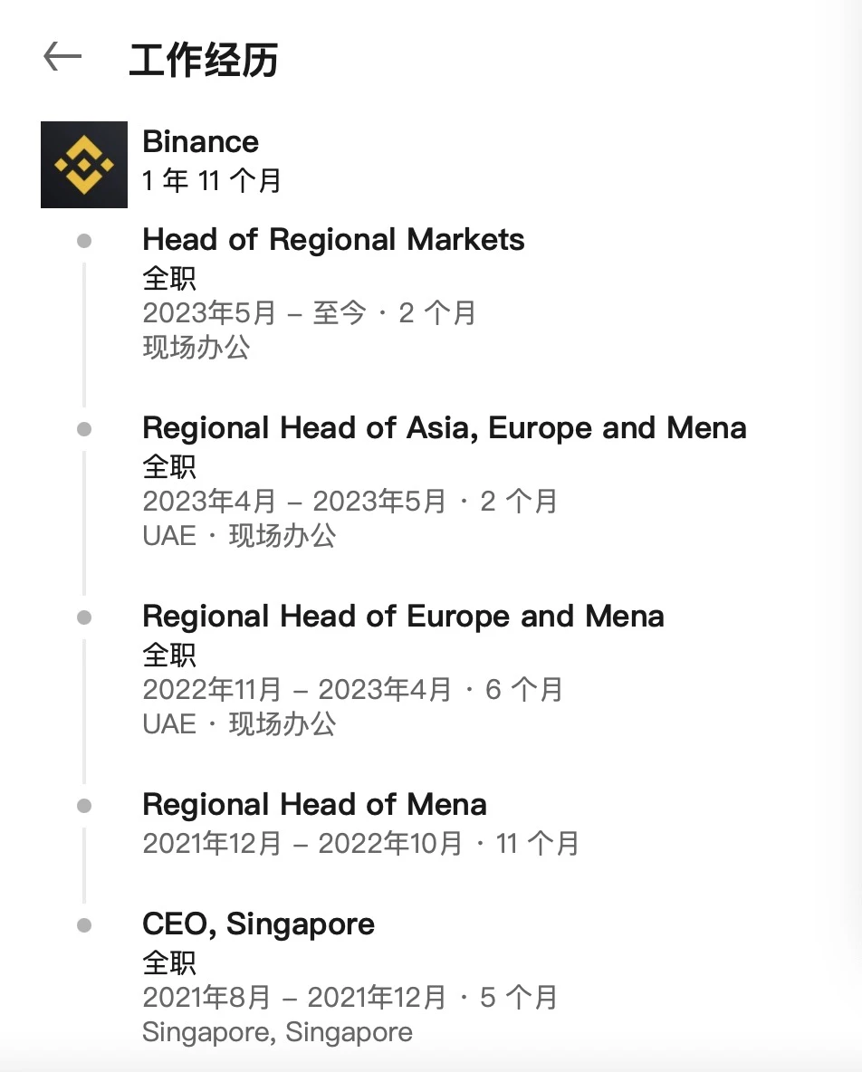 2021 年 8 月,Richard Teng 加入币安担任新加坡区域首席执行官。2021 年 12 月至 2022 年 10 月期间,Richard Teng 出任币安中东和北非区域新负责人。2022 年 11 月之 2023 年 4 月,Richard Teng 担任亚洲、欧洲、中东和非美区域主管,并在 2 个月后被任命领导美国以外的所有区域市场。从时间线来看, Richard Teng 在过去不到两年时间里晋升了四次, 几乎是火箭速度 被提拔。