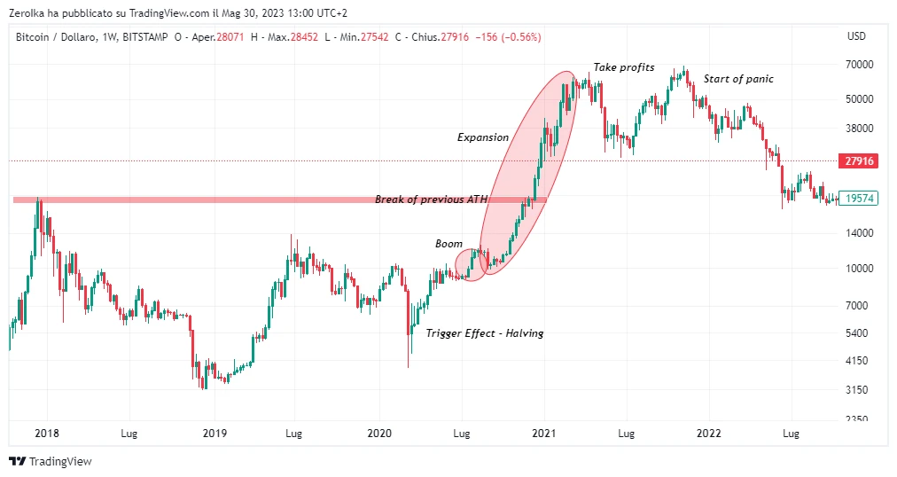 在第一个阶段中,价格缓慢上涨,然后到达一个点,开始加速上涨。