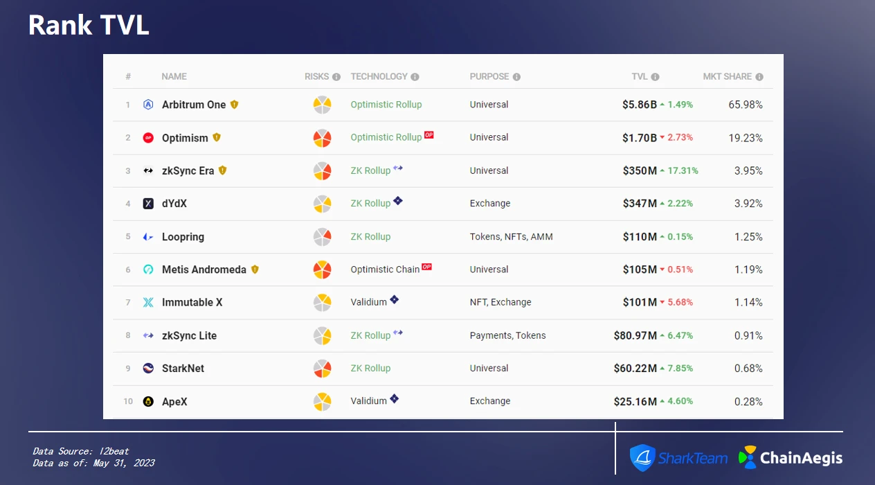 5 月 31 日,zkSyncc Era 生态总 TVL 达到 3.5 亿美元,占 Layer 2 所有项目 TVL 总和的 3.95% ,排名第 3 。尽管与 Arbitrum 和 Optimism 相比还有较大的差距,但 zkSync Era 上线仅 2 个月,TVL 增速很快,值得关注。