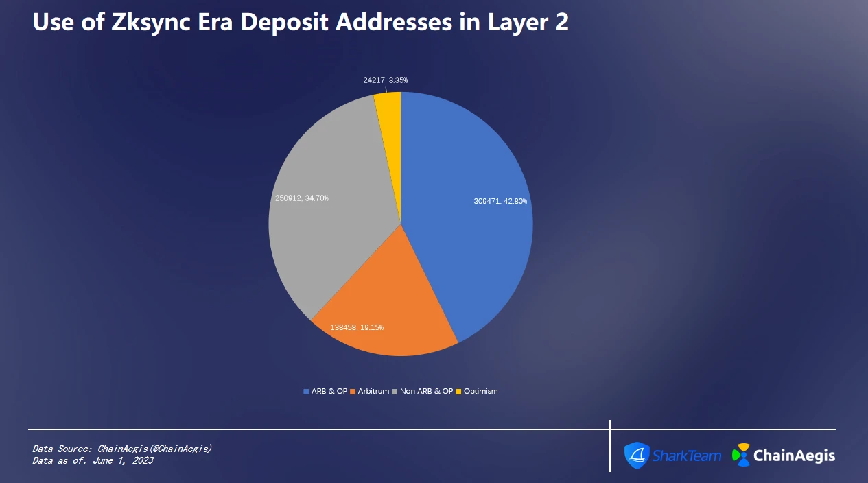 6 月 2 日, zkSync Era 存款地址总数为 72.3 万个。其中与 Arbitrum 和 Optimism 都进行过交互的地址数为 309, 471 ,占比 42.8% ,未与之进行过交互的地址数为 24, 219 ,占比 3.35% 。 3 月 25 日,当日存款地址数达 41, 341 ,达到高峰, 3 月底交易活跃。在每日存款地址数中,新老地址比为 4: 1 。大多数地址只进行一次交易,重复交易的地址数较少。