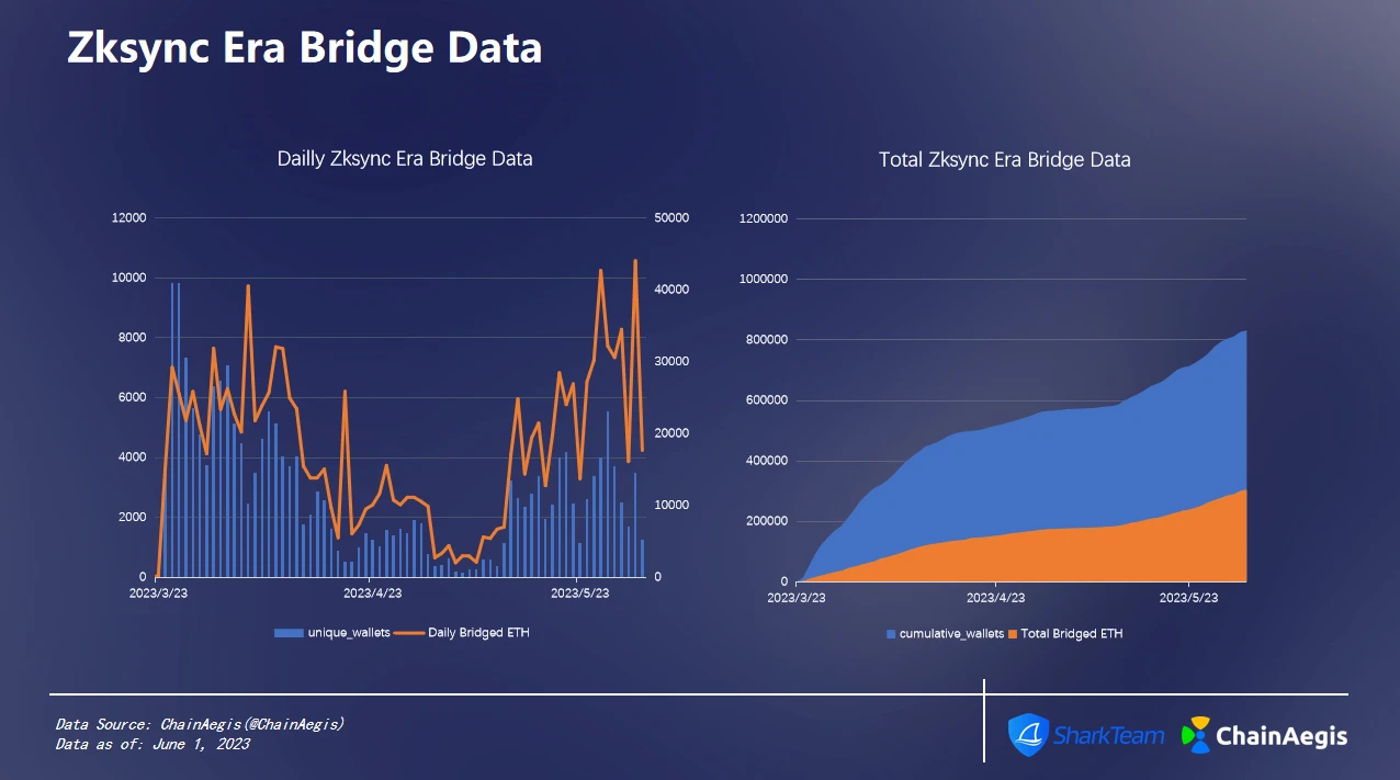 zkSync Era 官方桥支持从以太坊主网跨到 zkSync Era ,并且允许任何 ERC 20 的代币进行 转化 。 5 月 31 日,当日跨链桥转移 ETH 数量为 10, 576.76 枚,达到高峰。截止到 6 月 1 日,从 ETH 跨链到 zkSync Era 的 ETH 总数达到 30 多万个,平均每个地址 0.42 枚 ETH 。