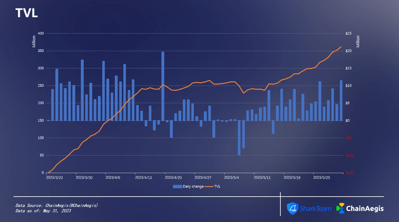 3 月 24 日 zkSync Era 主网向所有人开放,到 4 月 14 日, 20 天的时间, TVL 达到 2.41 亿美元,平均每天增加 1000 万美元。 4 月 15 日, TVL 与前一天相比减少了 152 万美元,开始震荡, 5 月 17 日之后, TVL 重新开始逐步攀升, 5 月 31 日, zkSync Era 的 TVL 达到 3.61 亿美元。