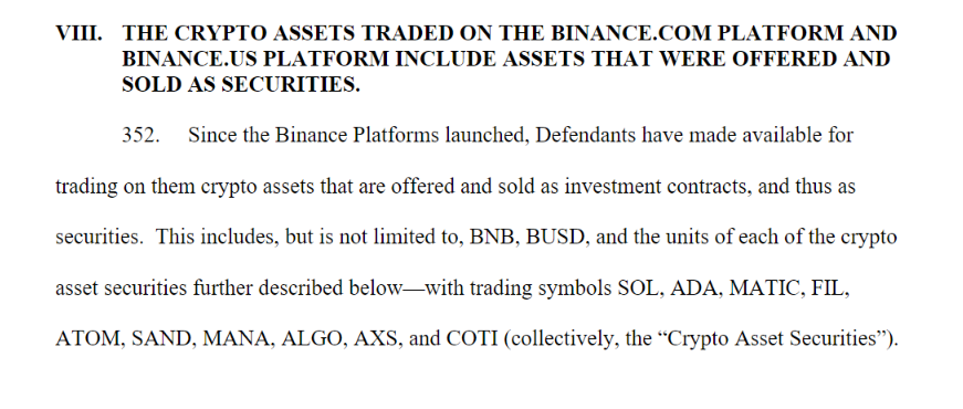 3、SEC 指控 Binance.US 销售作为证券的代币包括但不限于 BNB, BUSD, SOL, ADA, MATIC, FIL, ATOM, SAND, MANA, ALGO, AXS, COTI。SEC 强调列出的代币是“包括但不限于”。值得注意的是 ETH USDC USDT LTC 等交易量较大的代币没有被列入。此前美国 SEC 主席曾表示除了比特币以外的任何加密货币可能都含有证券属性。