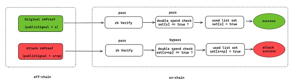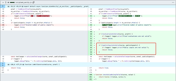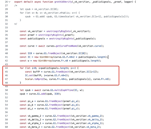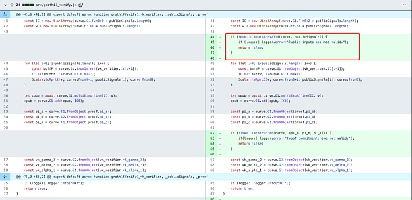 使用snarkjs库进行链下验证时,在groth16Verify函数中并未校验publicSignals参数的取值范围合法性,导致可以伪造证明通过校验: