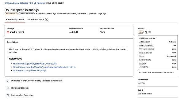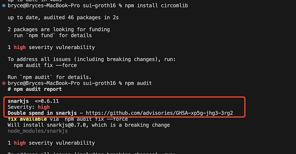 同时该高危漏洞也被更新到npm库中,安装旧版本snarkjs库时会有如下预警信息: