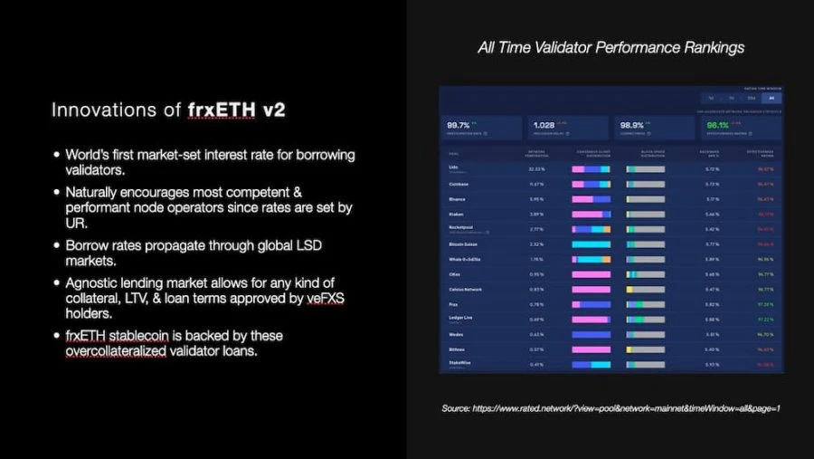Sam Kazemian 称,「这确保了 frxETH 节点以去中心化的方式成为性能最高的运营商,没有白名单、KYC 以及声誉要求。frxETH v2 节点将在性能排名中名列前茅,,就像 frxETH v1 验证器在 PoS 历史上的所有节点中排名最高一样。」