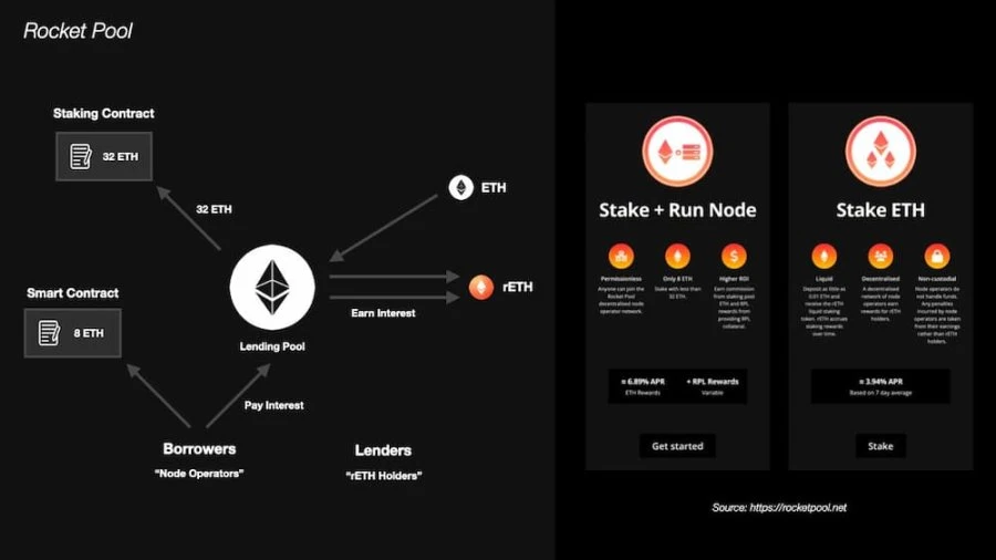 比如,Rocket Pool 的「Stake ETH」产品允许用户质押 ETH 来获得 rETH,也就是说,借出 ETH,获取收据代币 rETH;「Stake + Run Node」产品是,借用 32 ETH 来运行验证器,向贷方支付利息。