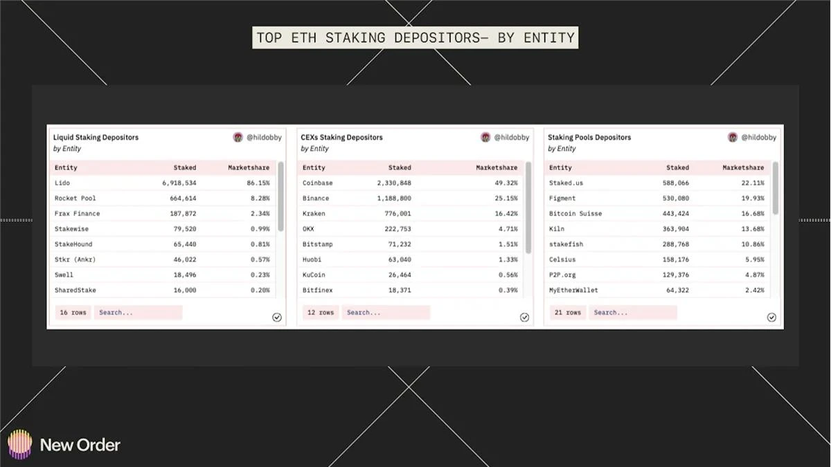 从现有的三个类别来看,Liquid Staking 市场明显被一个协议高度集中控制,而 Coinbase 和 Binance 在 CEX 市场上具有明显优势。质押池类别最为分散,Staked.us、Figment、Kiln、stakefish 和 Bitcoin Suisse 占据了其市场份额约 74% 。