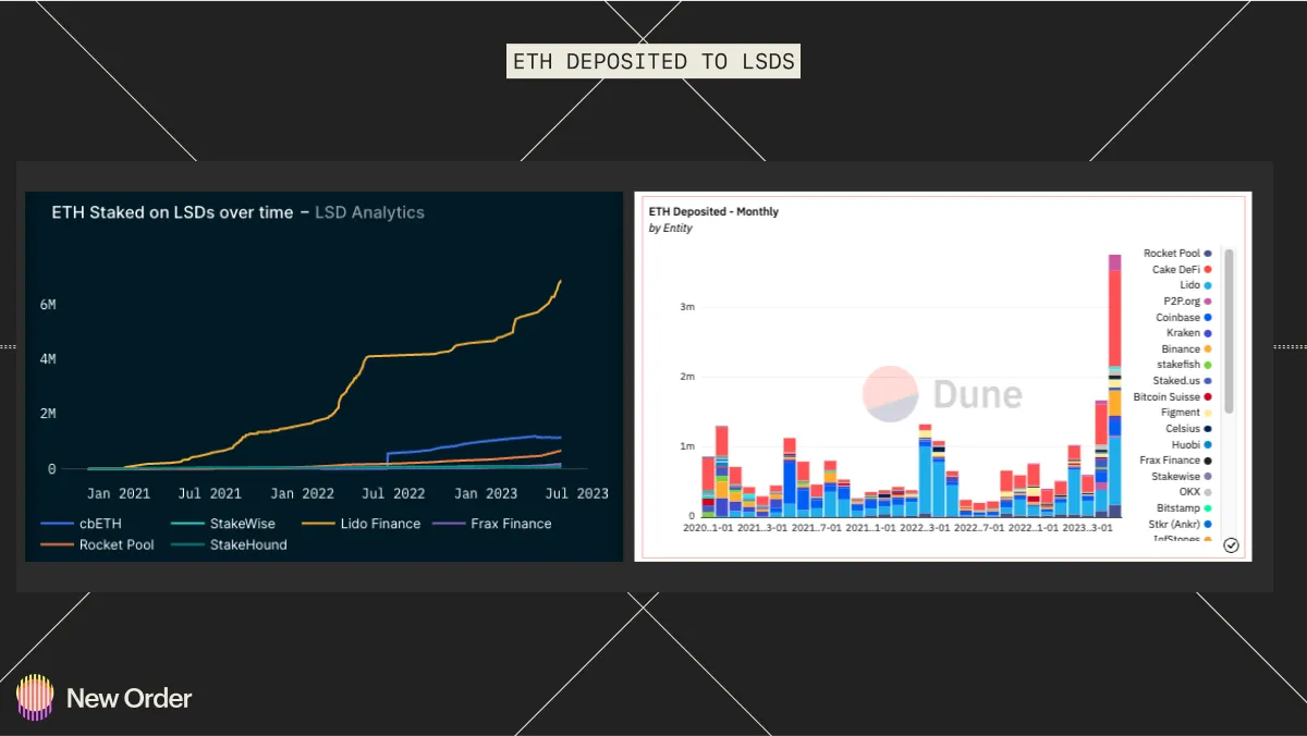 总体而言,短期内关于以太坊质押的用户行为表明了市场整体反应的积极性。Shapella 导致通过 Liquid Staking Derivative(LSD)协议和代币(如 Lido)进行质押的增长巨大。在 Shapella 之后,通过 LSD 和整个行业抵押的 ETH 的增长在所有类别中都出现了最大的总存款月。