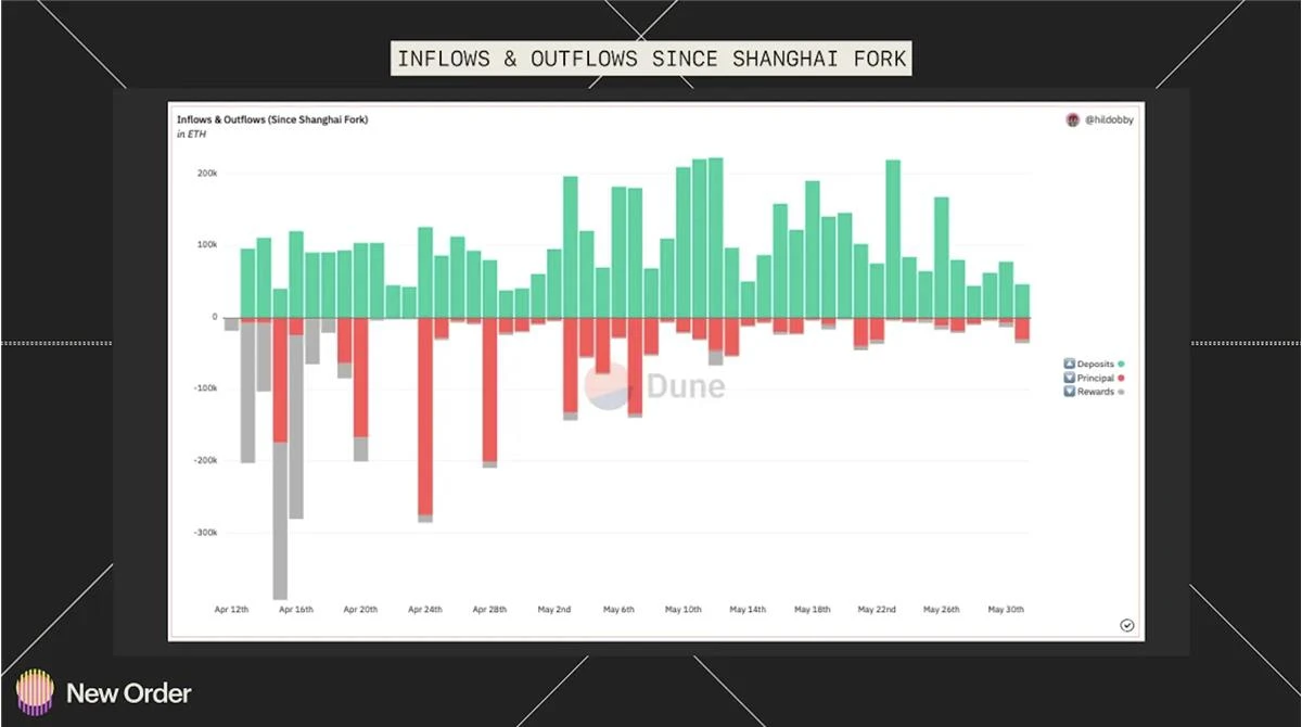 目前的以太坊质押数据表明,存在对 ETH 收益的明显需求,而想通过队列退出的验证人数量不足。根据 Dune Analytics 的数据(截至 5 月 31 日),质押的 ETH 比例约为 18% 。自 Shapella 在 4 月 12 日发生以来,总净流入存款方向,约有 2, 263, 119 个 ETH 流入质押资产。这个数字可以通过以下公式计算得出: