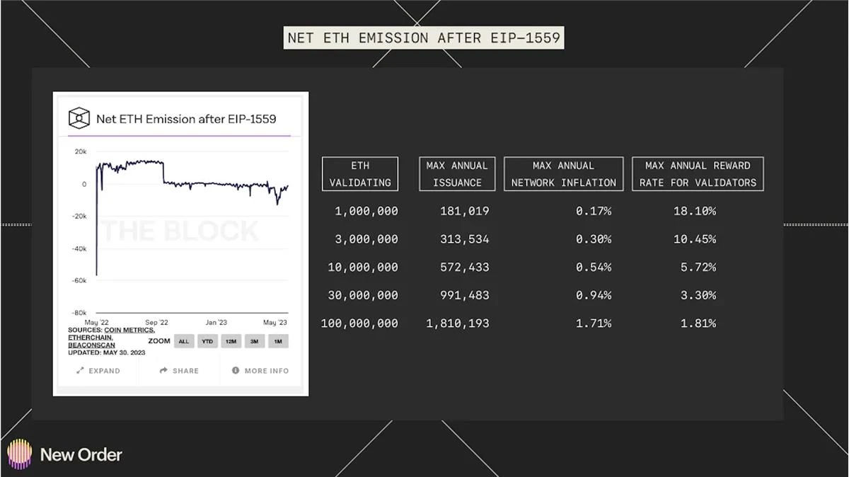 这是因为用户不再支付由于以太坊切换共识机制和 Shapella 的非流动性溢价所带来的技术风险成本。有预测称,这一数字将趋近于其他主要权益证明网络中看到的 60% 的平均水平,并最终趋向 90% 以上。这可能会将当前 73 万个验证者的数量增加到超过 200 万个。在这种情况下,每个验证者获得的收益很可能会降低。这是因为验证者收益组成及其如何根据特定变量(例如总质押金额)而变化。以太坊验证者从三个不同的来源获得收益:区块奖励、Gas 小费和最大可提取价值(MEV)奖励。区块奖励是基于 PoS 产生的新 ETH 代币。随着质押比率的增加,网络的年通胀率也会上升,每个质押者获得的收益会降低。这可以在下图中粗略地看到。