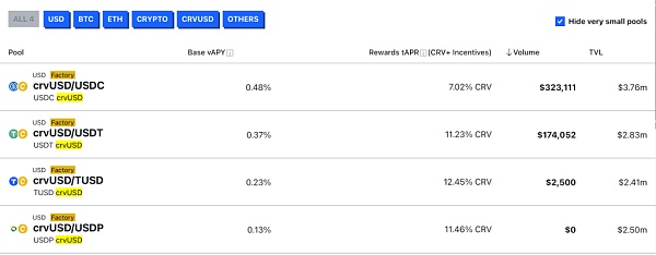 在 crvUSD 借贷介面正式上线后,Curve 的前端页面已可看到 crvUSD 流动性池的完整数据,当前各流动性池的 TVL 皆在 2、300 万美元之间。