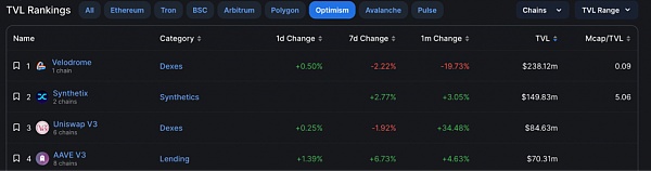 Synthetix 作为 Optimism 的重要合作伙伴,早在 2021 年 7 月就已部署到 Optimism 上,接着 Synthetix 鼓励用户将质押的 SNX 转移到 Optimism,交易和收入也逐渐从以太坊主网转移到 Optimism 上。据defilama 5/26 数据, Synthetix 在 Optimism 上占据第二、TVL 1.49 亿美元。