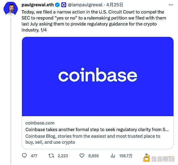 而作为 Coinbase 阵营中此番直面 SEC 的“中军大将”,首席法务官 Paul Grewal 在强调“愿与 SEC 战至最高法院,且 Coinbase 必将胜诉”之决心的同时,也在个人社交账户及媒体采访中反复提起另一起诉讼事宜(Coinbase 主动起诉 SEC),大有将其作为扭转战局“胜负手”的味道。