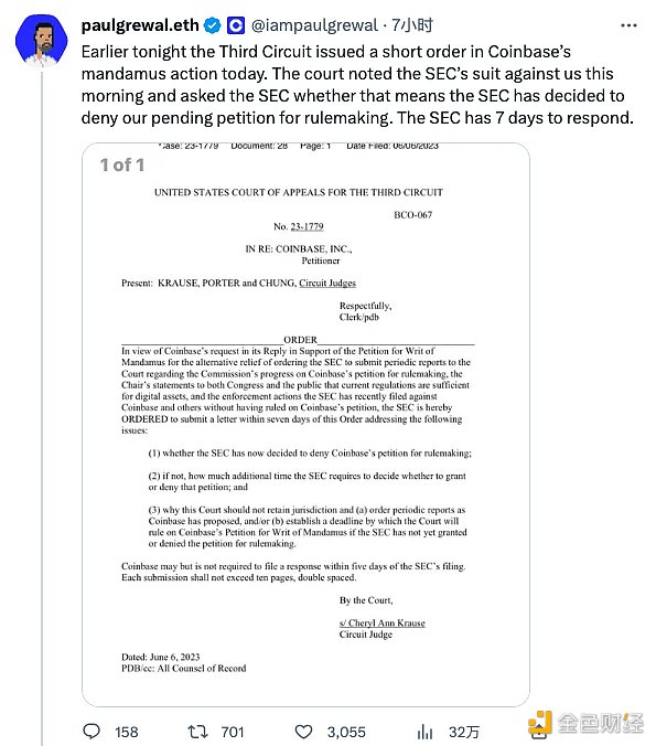 今日凌晨,第三巡回上诉法院发布文件称,已经注意到 SEC 对 Coinbase 及其他交易所提起了诉讼,因此要求 SEC 在 7 天之内就“是否已决定拒绝 Coinbase 的请愿”做出回应,具体来说 SEC 需回应以下三个问题: