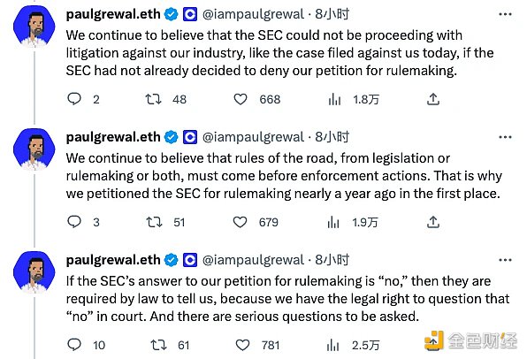 如果 SEC 尚未决定拒绝该请愿,那么 SEC 就不该像现在这样对我们以及整个行业提起诉讼,因为立法或监管规则的制定应早于具体执法行动。