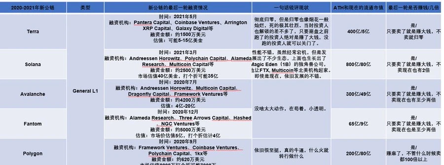 从 General L1来看,我把它们定义成大而全,最宏大的叙事的L1,每个人都是 Eth killer,每个人都想做出自己的生态。即使是最后一轮投,甚至是发币之后一级半投,即使放到现在的估值,都是两倍以上,如果能在高点卖掉(而且能卖掉,因为解锁了),倍数相当高,是最优解。
