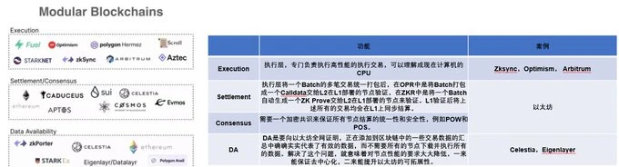 2022 年 Celestia 提出了模块化区块链的概念,即区块链应该分成 4 部分,Execution 执行,Settlement 结算,Consensus 共识和 DA 数据可用性。其中 Execution 和 DA 是最值得重点关注的对象。这两部分承担了最上层(执行)和最底层(存档交易)的业务。