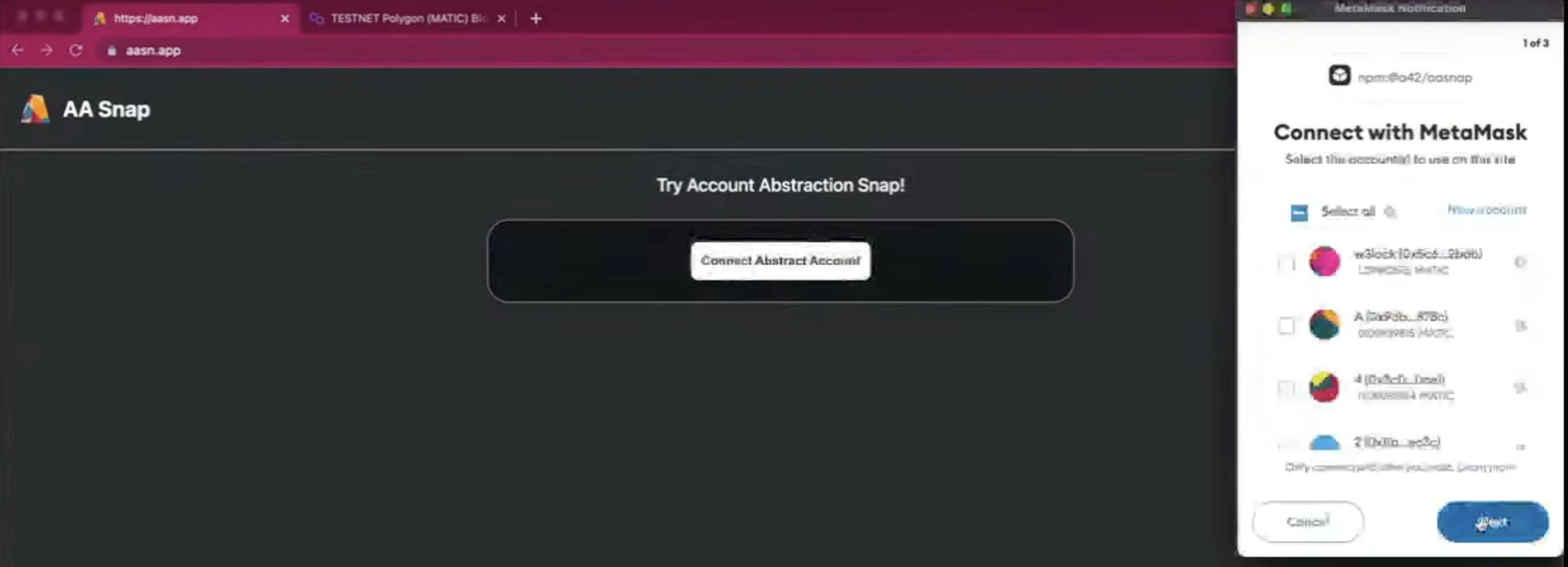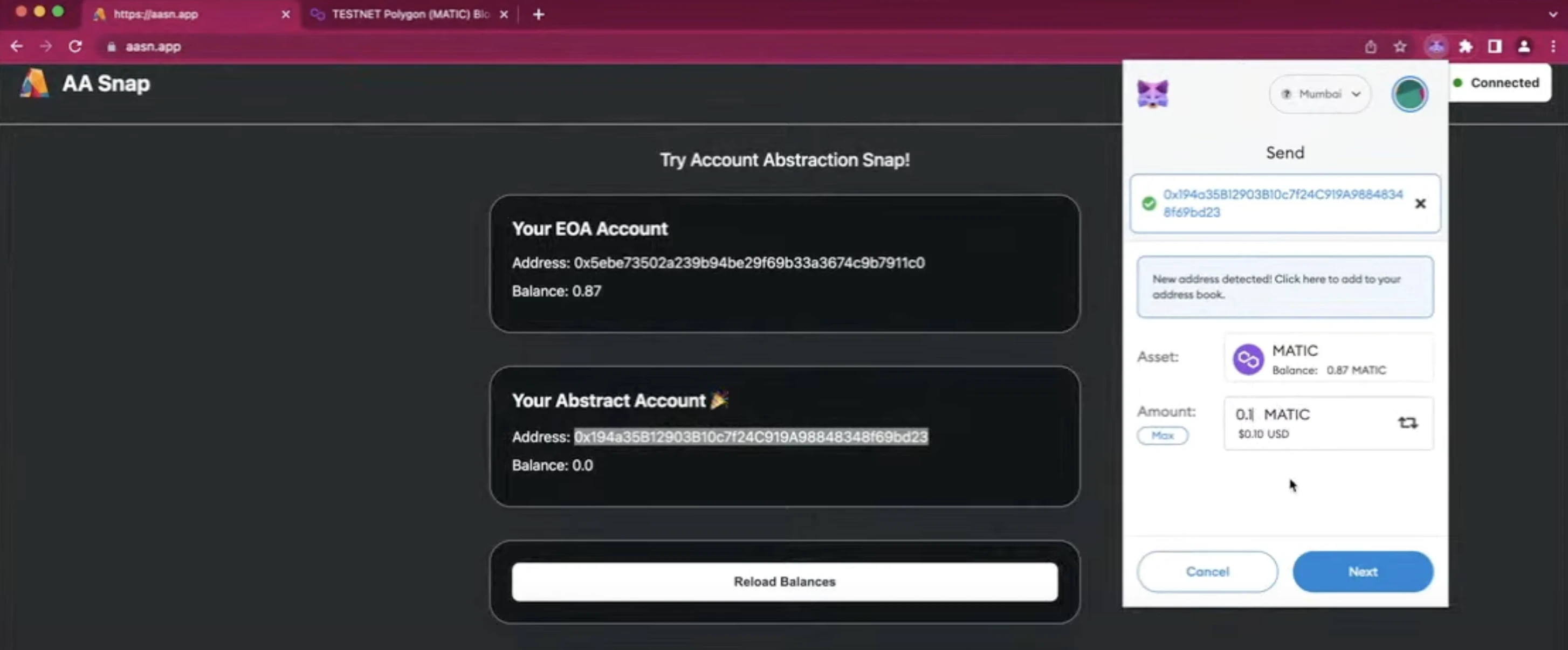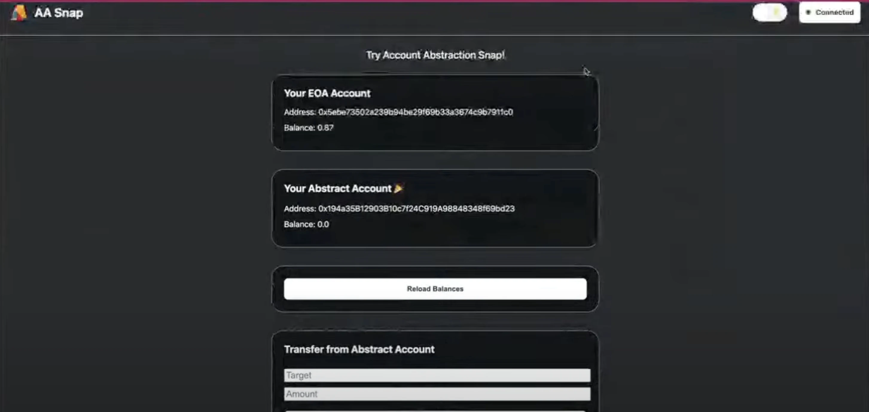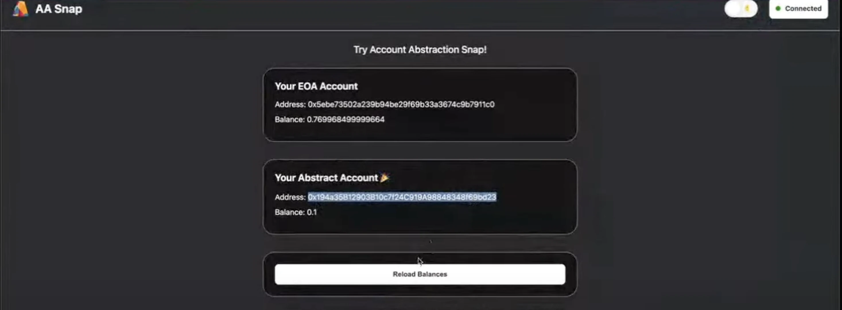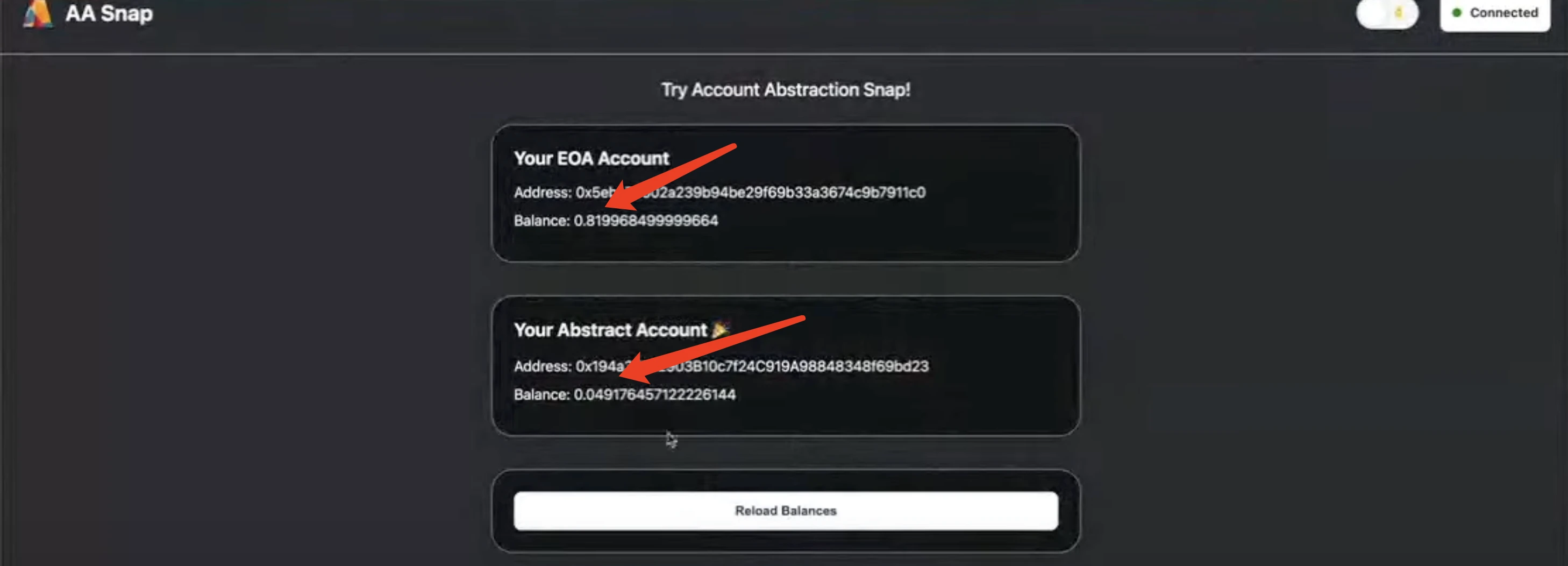 4 )接着你可以看到你的 EOA 钱包和账户抽象钱包,账户抽象钱包是合约钱包,因此它的地址是确定的且在连接 MetaMask 后自动生成的