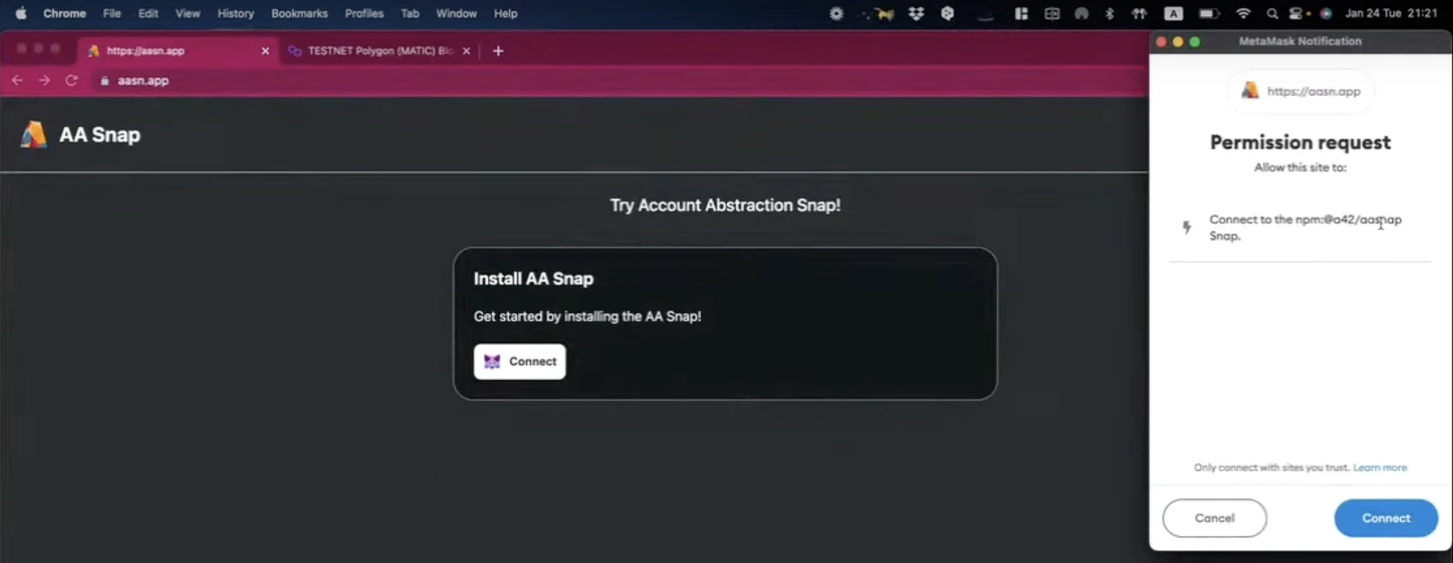 迄今为止,由于使用与以太坊不同的地址和帐户格式,StarkNet 尚未与 MetaMask 直接兼容,换句话说即非 EVM 兼容。而 StarkNet Snap 允许用户通过基于他们原本的 MetaMask 秘密恢复短语 (SRP) 创建一个 StarkNet 帐户来管理 StarkNet 上的资产, StarkNet snap 还允许开发者部署 StarkNet 账户,在 StarkNet 上进行交易,并与 StarkNet 智能合约进行交互,它可以与任何 dapp 连接以访问 StarkNet,开发人员可以尝试将他们的 dapp 与此 snap 集成。