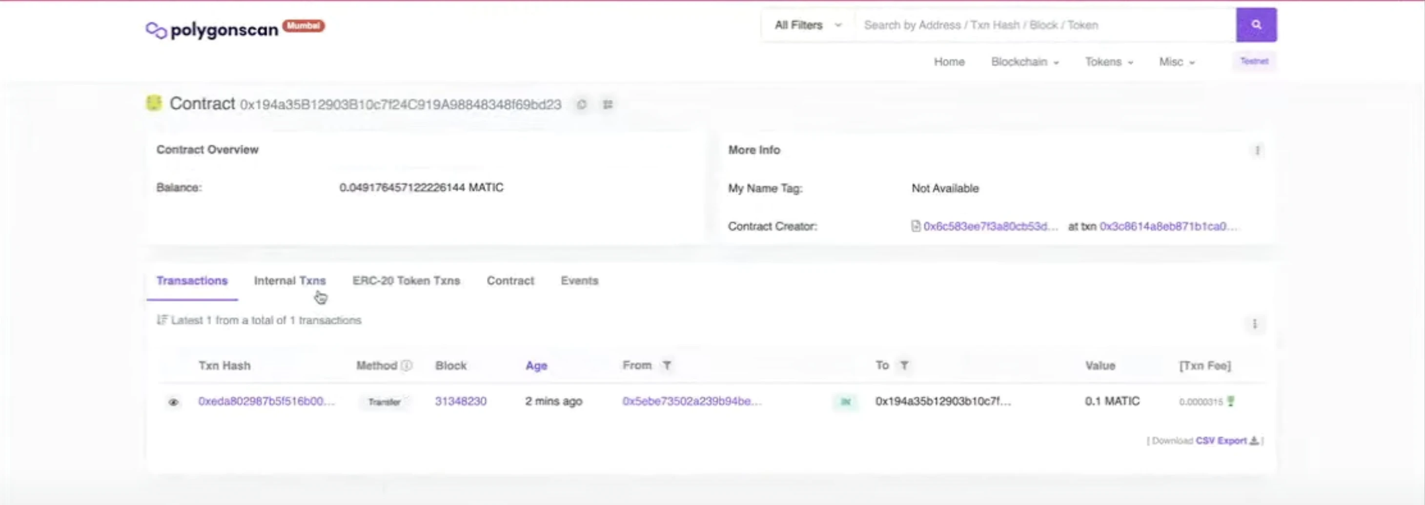 7 )最后可以去 polygonscan 查询合约账户是否部署成功(可以看到已经部署成功)