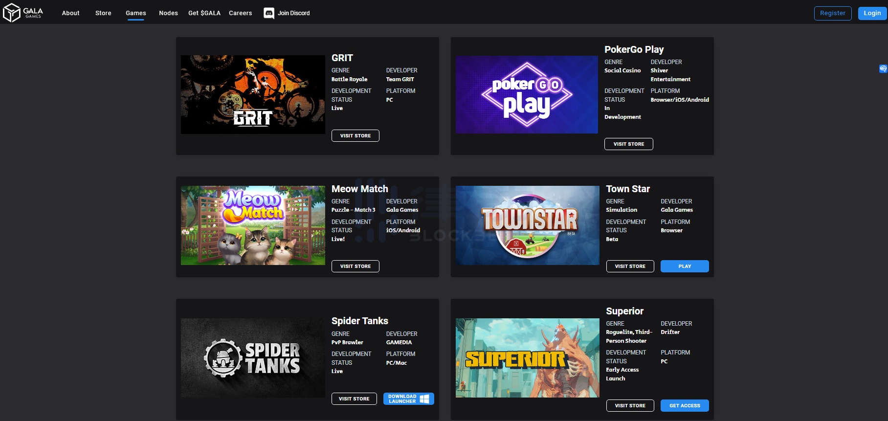 目前,Gala Games 已经推出了 18 款游戏。除了备受玩家喜爱的官方自研游戏 Town Star、Meow Match、Mirandus 和 Last Expedition 之外,还包括来自其他工作室的 GRIT、PokerGo Play、Spider Tanks、Superior、Legends Reborn 等游戏。这些游戏涵盖了角色扮演、射击、模拟经营、卡牌策略和塔防等各种类型,游戏运行的平台也横跨网页端、PC 端、手机端等等,几乎囊括了所有流行的游戏类型和操作平台。