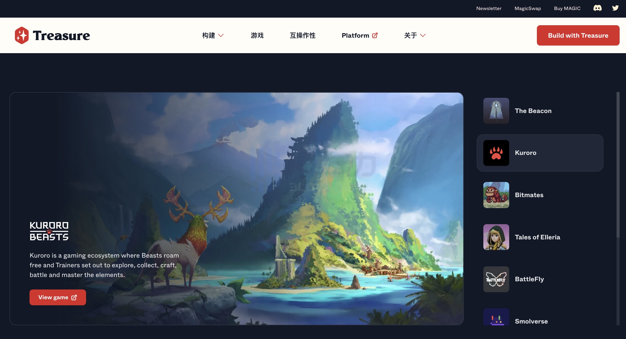 Treasure DAO 是一个建立在 Arbitrum 上由 MAGIC 代币连接的游戏生态系统,目标是建立一个「去中心化的任天堂」。Treasure 生态中的每个物品(Legions NFT、MAGIC 代币等)均为免费分发,Treasure 市场上的其他藏品也是免费、公平分发。Treasure 最初基于以太坊主网构建,但后来因为当时以太坊网络 Gas 成本居高不下,为降低用户门槛,Treasure 迁移到 L2 层 Arbitrum 链构建。