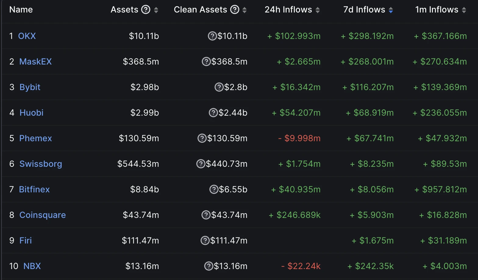 DeFiLlama 数据显示,过去一周,多家交易所均产生了可观的净流入。