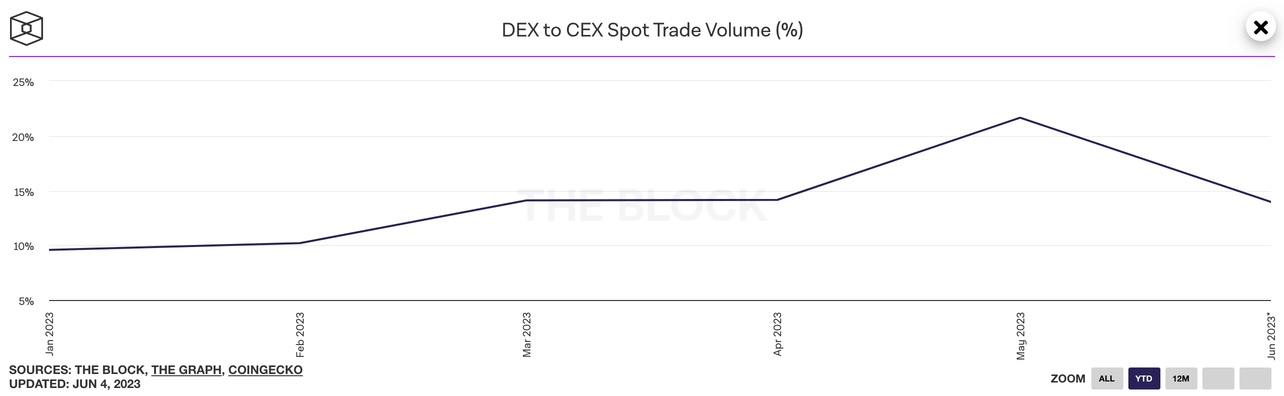 从更为宏观的时间尺度来看,CEX 向 DEX 的迁移早已出现趋势。The Block 数据显示,今年以来,DEX/CEX 交易量数据持续走高,在五月更是一度突破了 20% ,达到历史高点。无论本次诉讼事件是否出现,CEX 用户向 DEX 迁移算是个长远趋势。