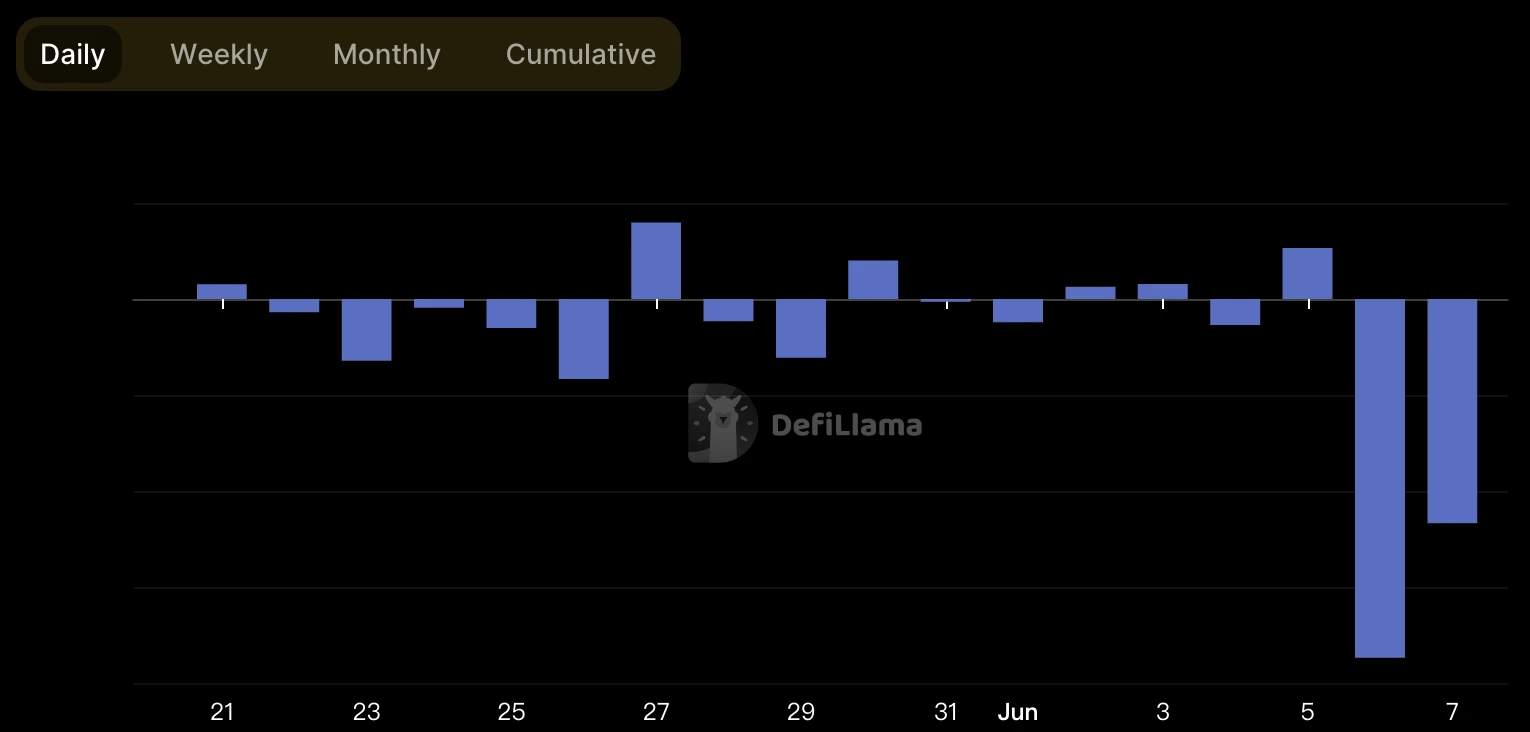 DeFiLlama 数据显示,币安 24 小时净流出为 6.6 亿美元;6 月 6 日至今,已流出 18.2 亿美元。