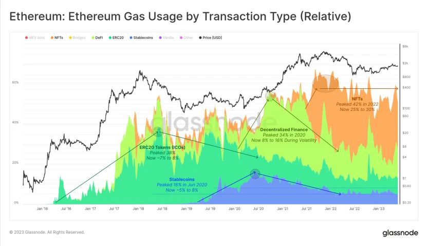 通过比较以太坊链上的各种主要活动类型的 gas 使用情况,可以大致了解不同周期的市场用户需求。根据 Glassnode 的统计,近几年来,以太坊生态系统主要有 4 种叙事,通常,在每种创新叙事的高峰期间都会推动 ETH 价格的上涨。